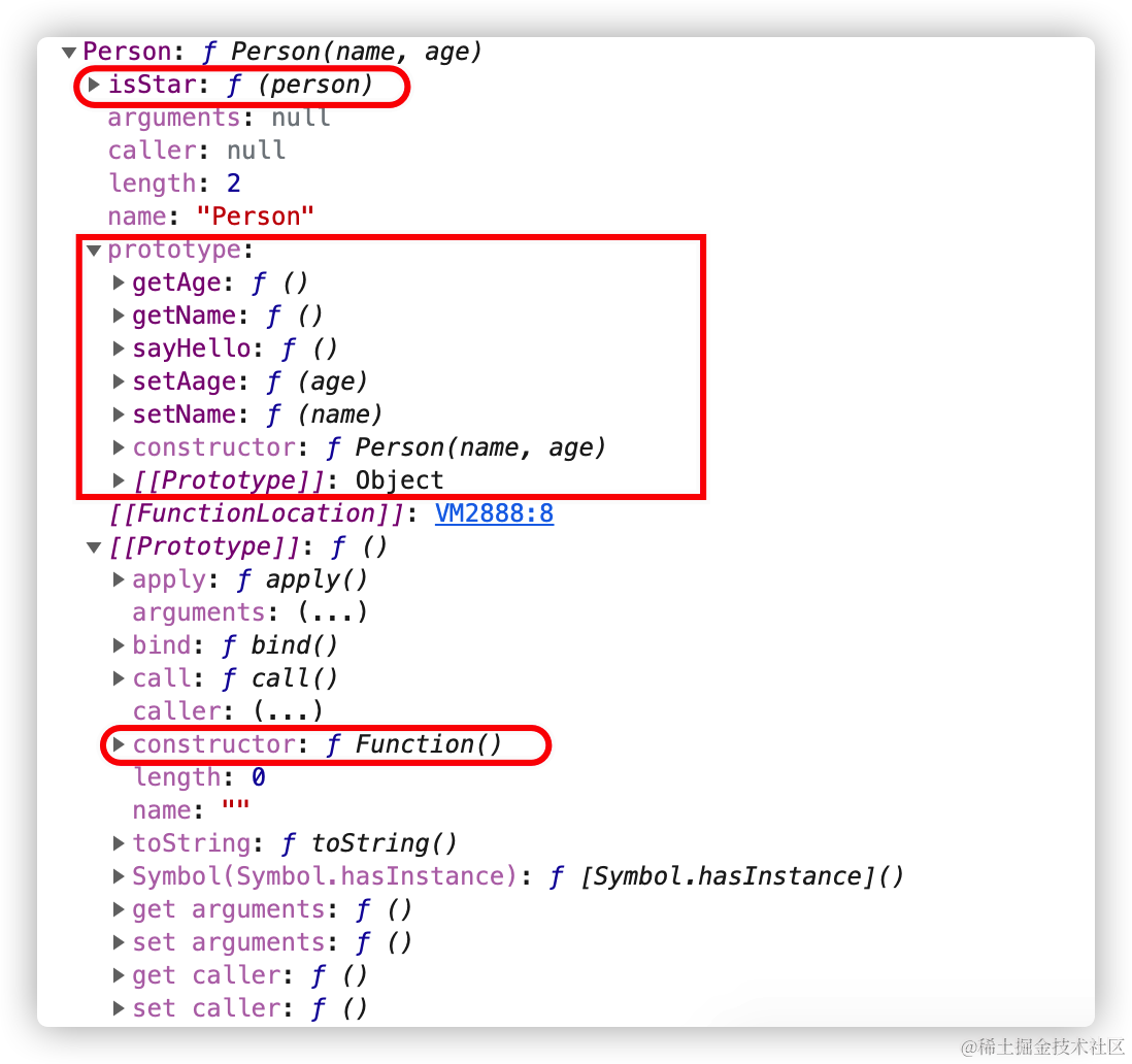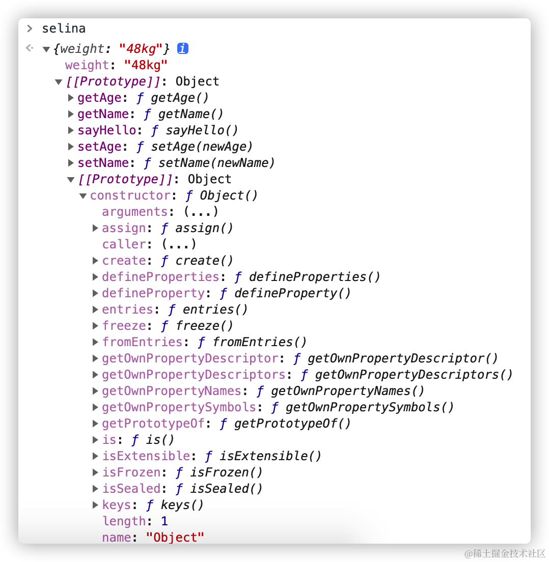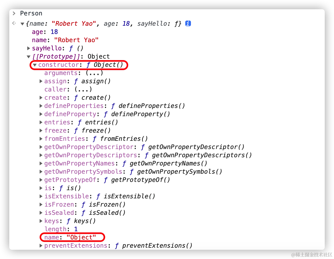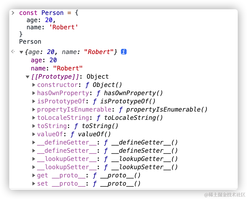 通过上图,可以清晰的看到 Person.__proto__(也就是图中的 [[Prototype]]),它的 constructor 对象的 name 属性是 Object。这说明 Person 对象是 Object() 的一个实例,也就是说对象字面量是 Object() 对象的实例。通过这个例子大家应该初步感受到原型链的能力了吧!