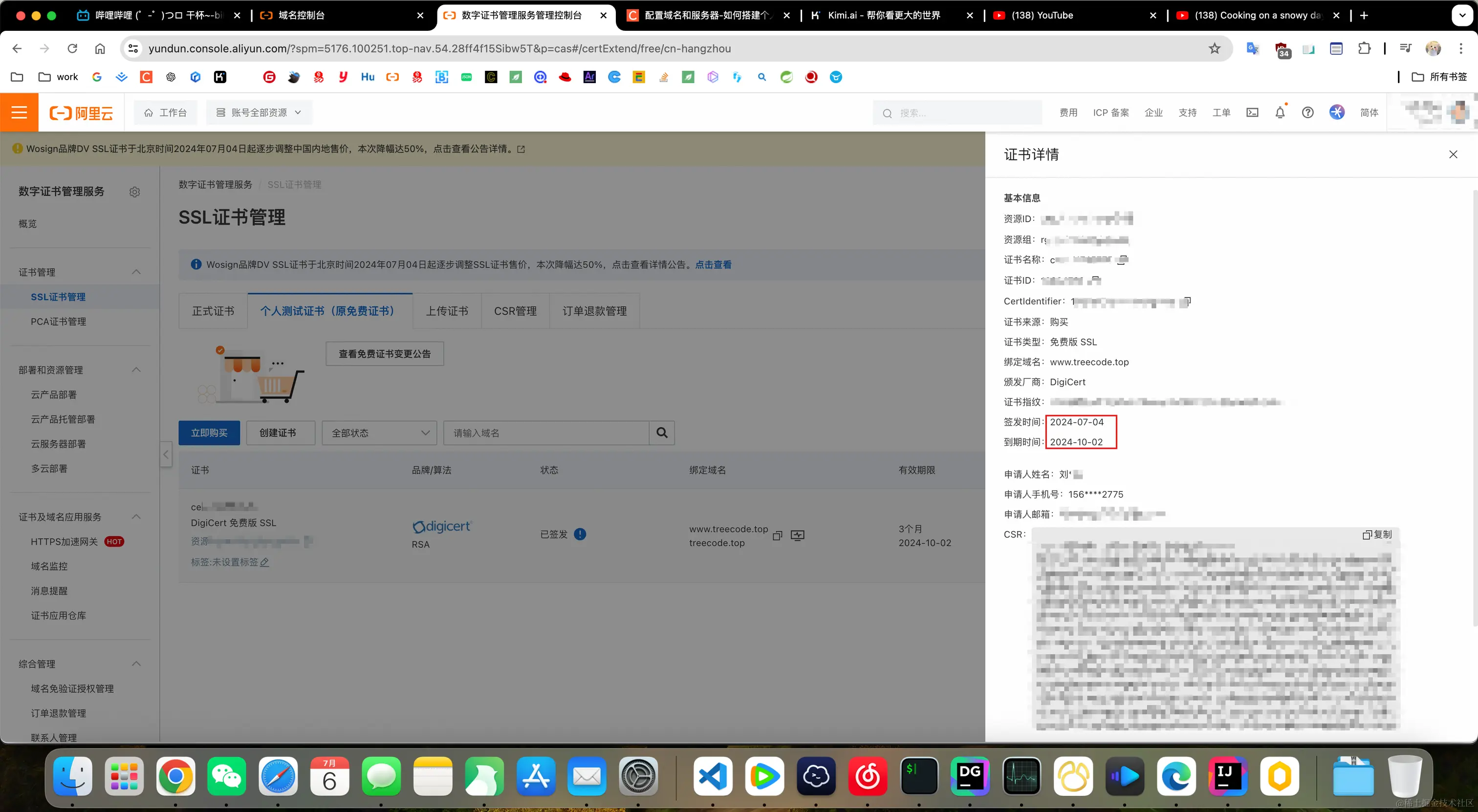 SSL证书分为两种:正式证书和个人测试证书,正式证书需要购买,个人测试证书免费,有效期三个月,阿里云每年单个域名可以签发20个免费证书,到有效期后再次下载新的免费证书替换即可,20个免费证书足够一年的使用量。