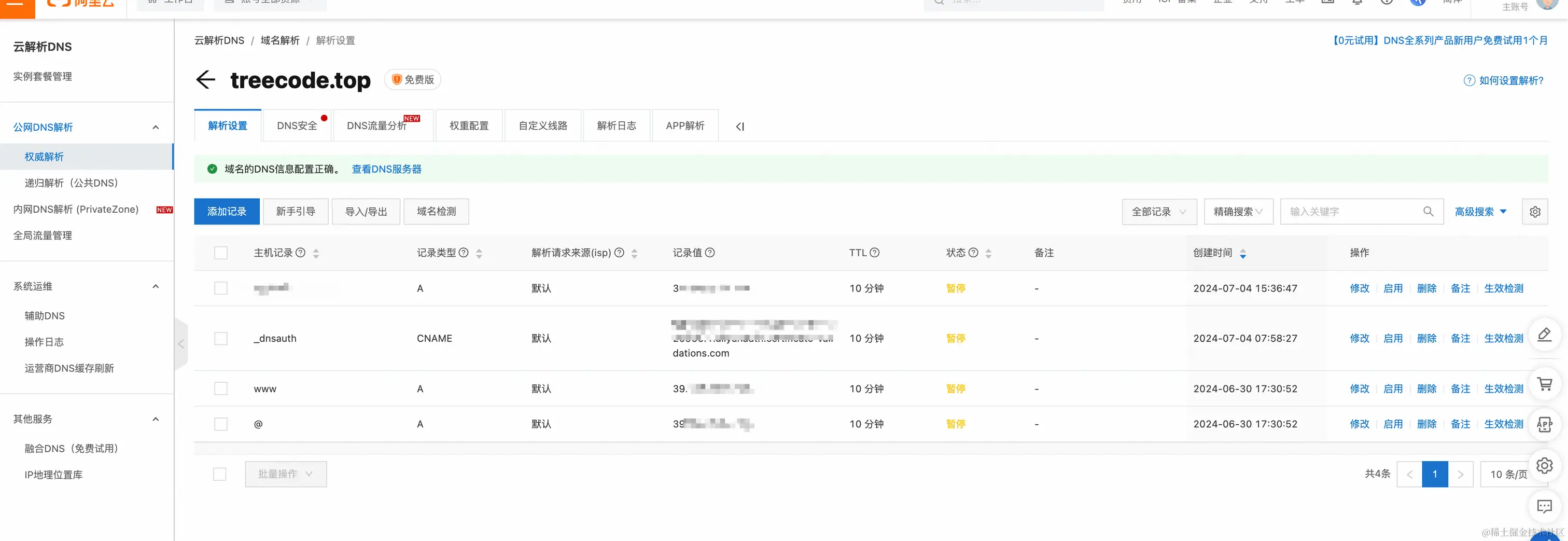 在域名服务商后台给自己的域名配置DNS解析,如果不知道如何操作,点击新手引导即可。完成后状态是绿色的正常,我是由于备案所以设为了暂停状态。