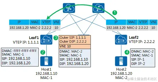 图中Leaf1和Leaf2作为VTEP,分别连接同网段的主机Host1和Host2,以Leaf1向Leaf2发送Type2路由为例。