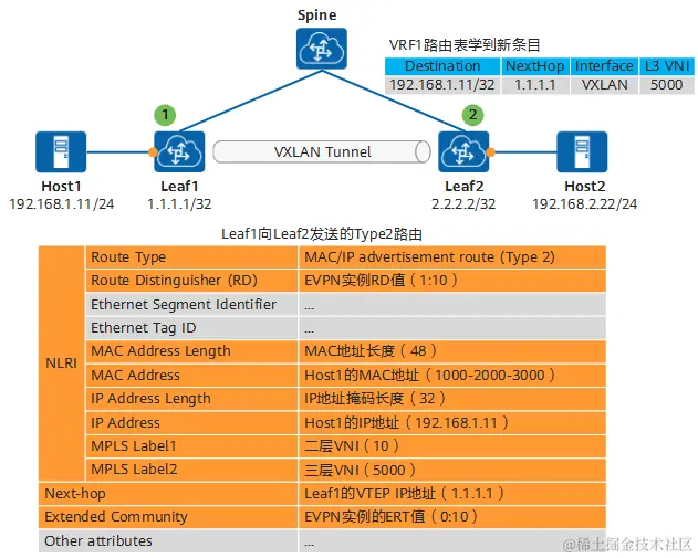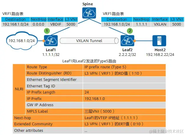 图中Leaf1和Leaf2作为VTEP,同时作为三层网关,分别连接不同网段的主机Host1和Host2,以Leaf1向Leaf2发送路由为例。