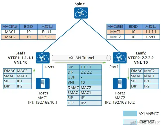 - Leaf2根据内层报文的目的MAC地址,从本地MAC表中找到对应的出接口,然后转发给对应的主机Host2。