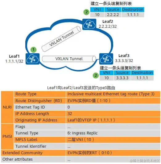 图中Leaf1、Leaf2、Leaf3作为VTEP,以Leaf1向Leaf2、Leaf3发送路由为例。