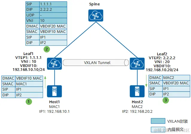 以Host1向Host2发送报文为例介绍报文在VXLAN网络中的转发流程: