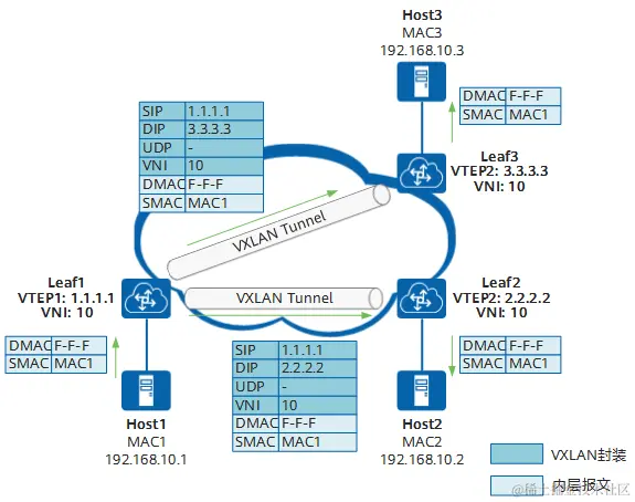 - Leaf2接收到VXLAN报文后,根据报文中VNI获取二层广播域,进行VXLAN解封装,获取内层的二层报文。