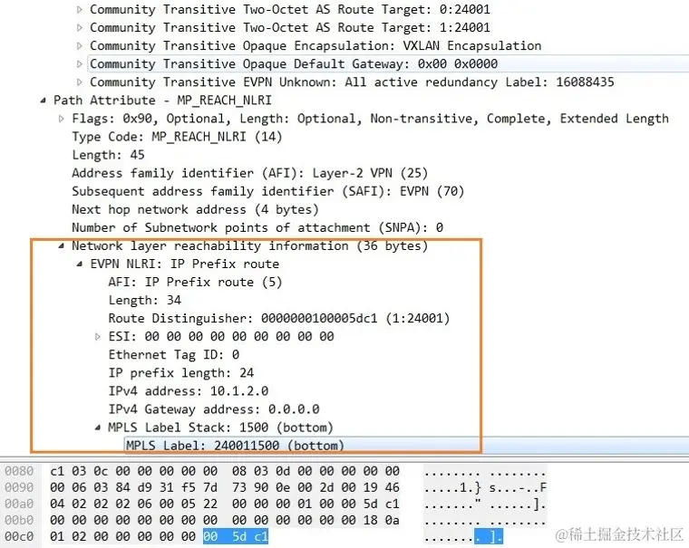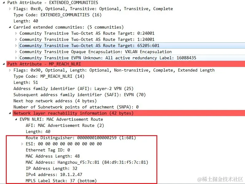 - MPLS Label(3 字节) : 该字段在VXLAN场景中没有实际意义。 该字段为此路由携带的三层VNI。