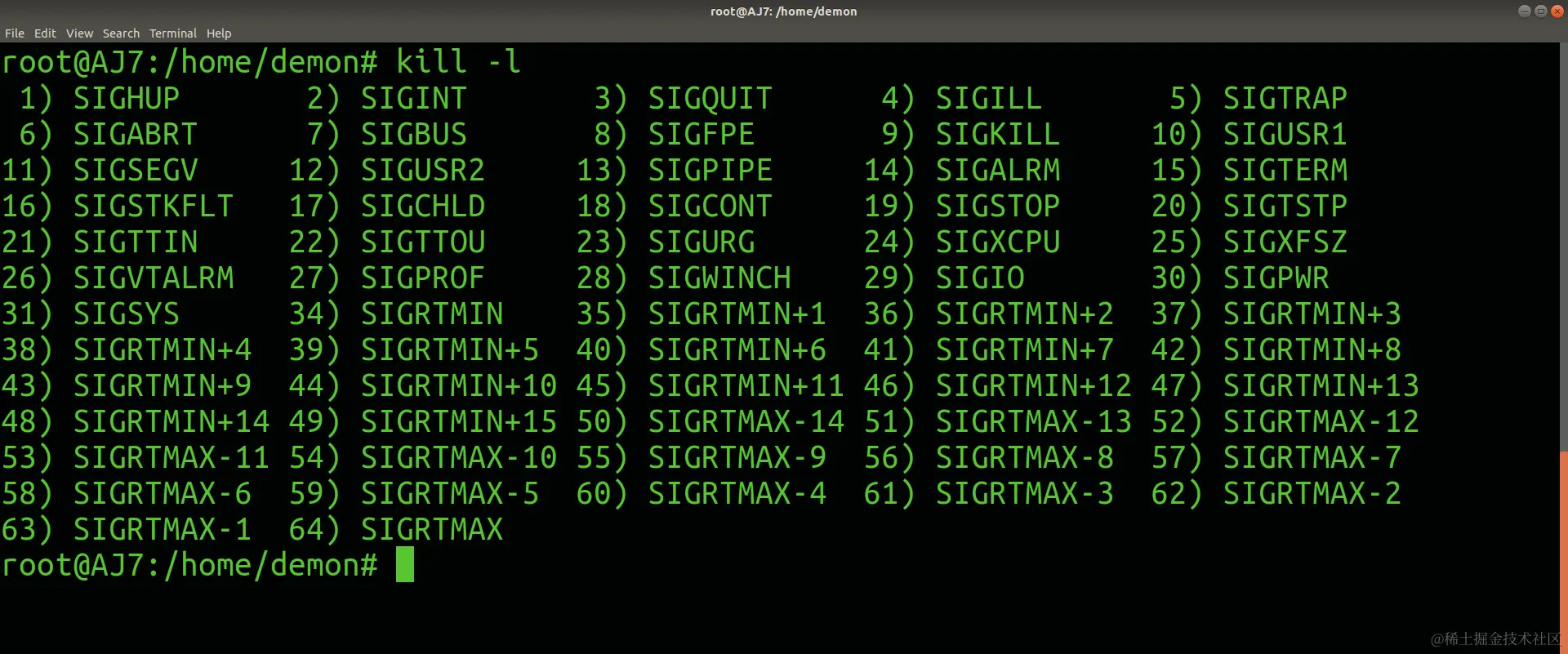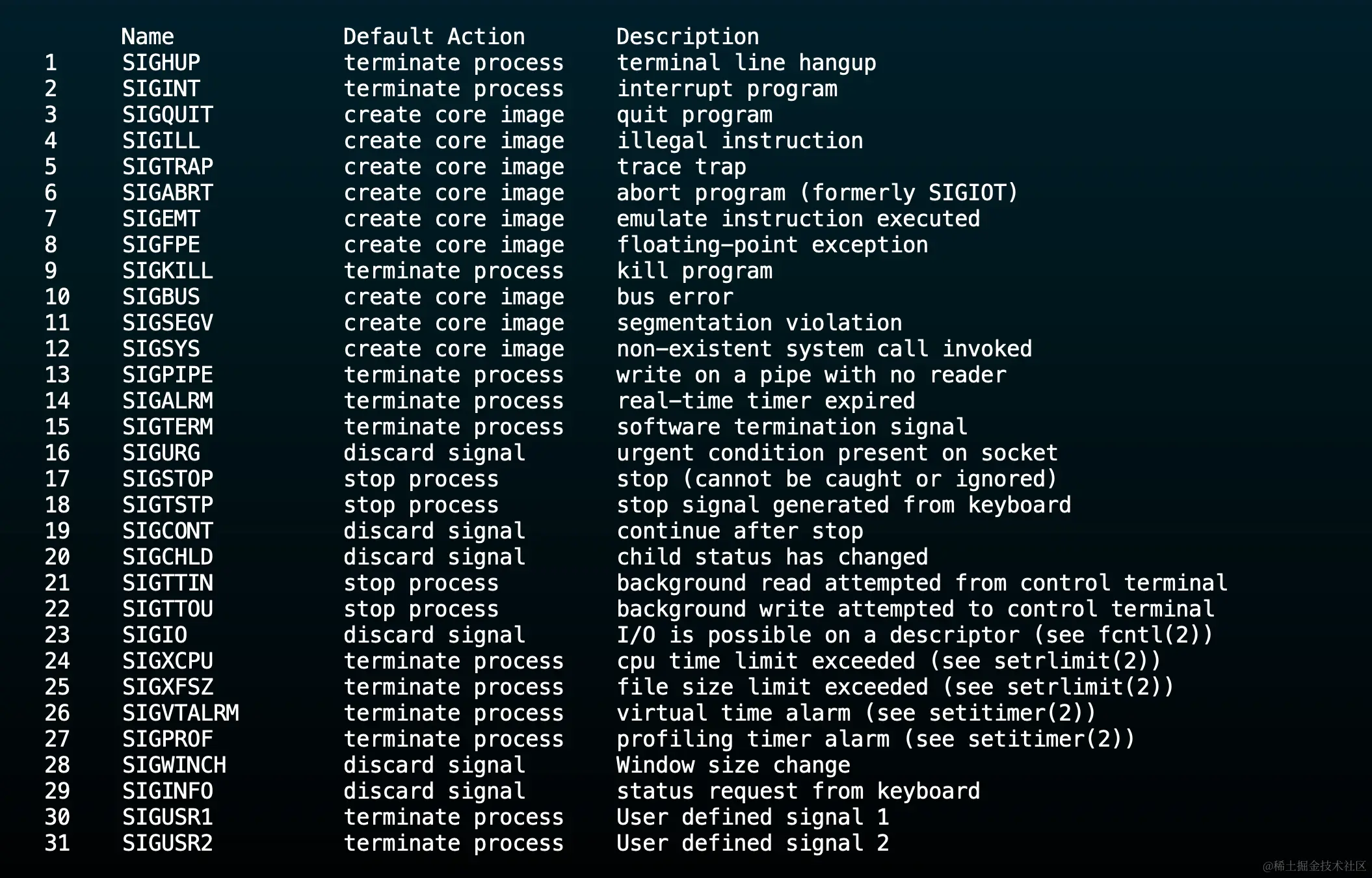 - 有些信号会终止接收进程:sighup、sigint、sigterm、sigkill