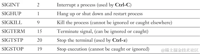 程序可以覆盖默认行为。例如,可以编写一个交互式程序来忽略SIGINT(由ctrl+c输入生成)。两个值得注意的例外是SIGKILL和SIGSTOP信号,它们不能以这种方式被忽略、阻止或覆盖
