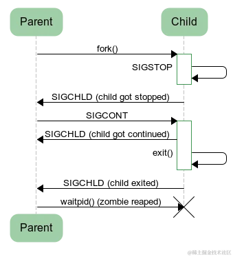 - 子进程退出:子进程完成后,它会退出。这会向父进程发送另一个 SIGCHLD 信号。