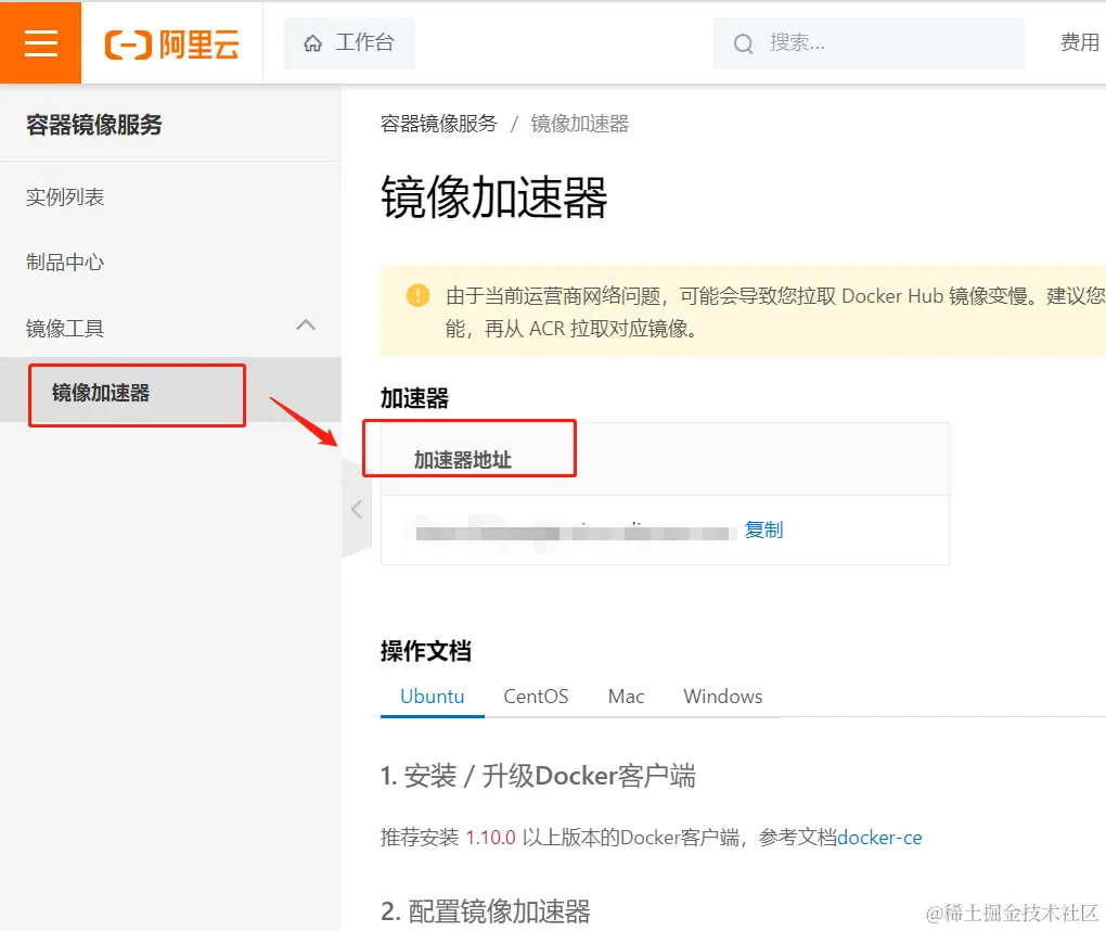 可以到阿里云容器服务获取镜像源地址。