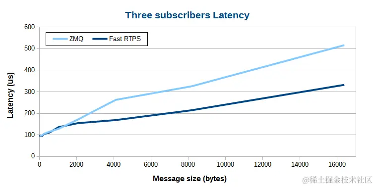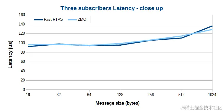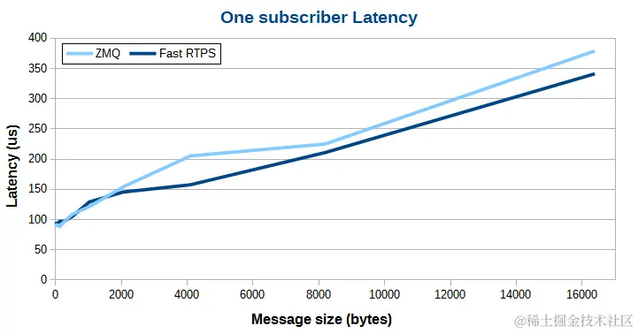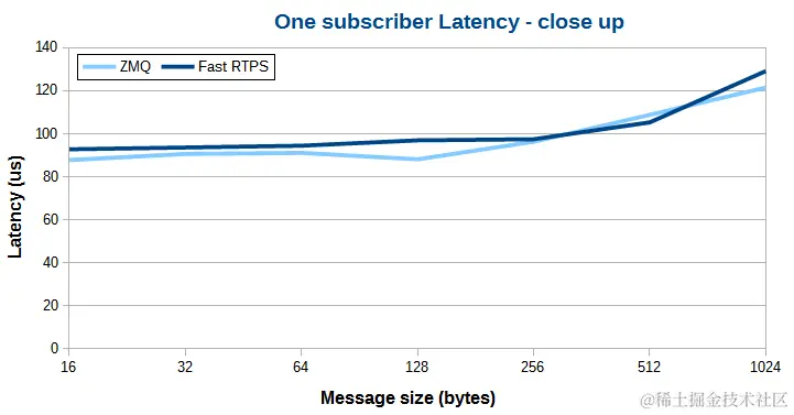 当传输数据量比较小时,Fast RTPS 和 ZeroMQ 延迟非常接近。数据量增大后,Fast RTPS 多播的优势越发明显,比如传输的数据量达到 16 KBytes 时,Fast RTPS 比 ZeroMQ 要快 200 us。