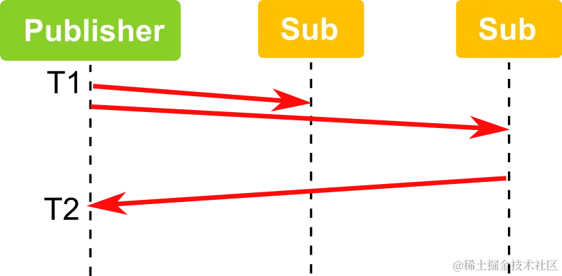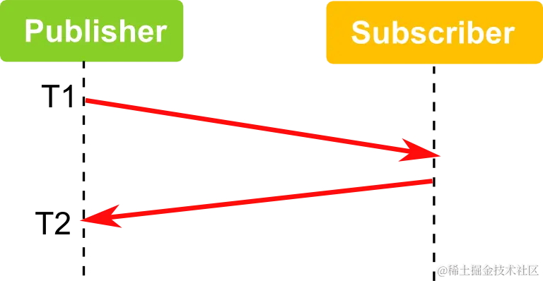 比如下面的图中,往返时间是 T2-T1,对应发布订阅模式中延迟时间将是 (T2-T1)/2。