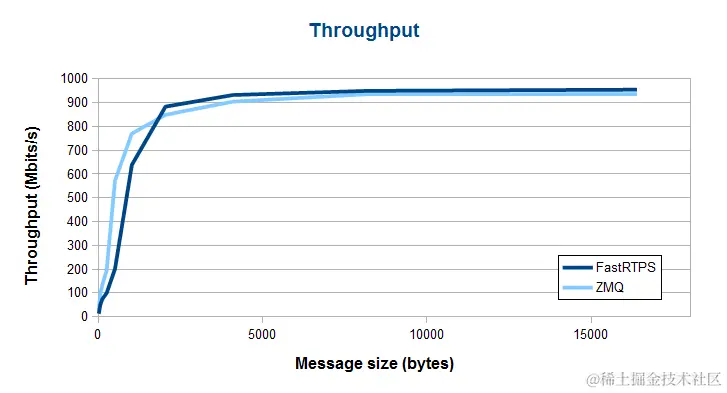再来看看 ZeroMQ 和 Fast RTPS 的数据吞吐量测试结果对比: