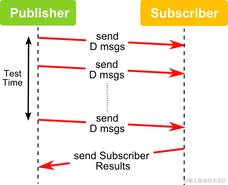 测试对比的时候,RTPS 在一定时间内发送多组消息,但是吞吐量不是一个固定值而是一个范围,既然是范围就有最大值,为了找到这个最大值,需要不断尝试不同的消息量 D,找到能实现发布者发送管道最大化同时订阅者接收没有丢包的值。测试过程可看下图: