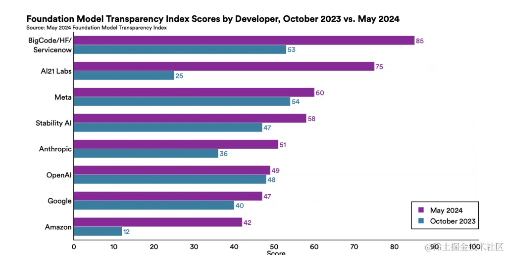 这次,来自 BigCode/Hugging Face/ServiceNow 的 StarCoder 基础模型的透明度得分达到 100 分中的 85 分,创历史新高。所有 14 个模型开发者的平均得分攀升至 100 分中的 58 分,比 2023 年 10 月的 FMTI 平均得分提高了 21 分。