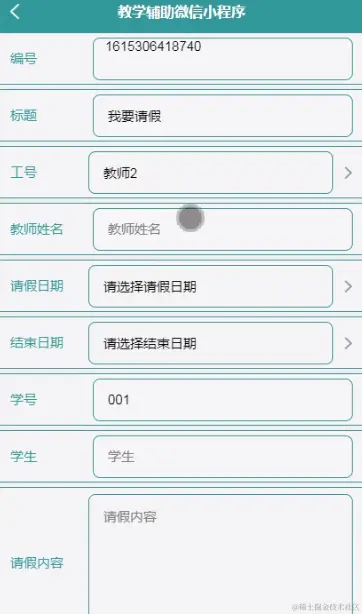 请假信息,学生通过请假信息页面进行添加请假内容,需要教师进行审核,如图5-13所示。