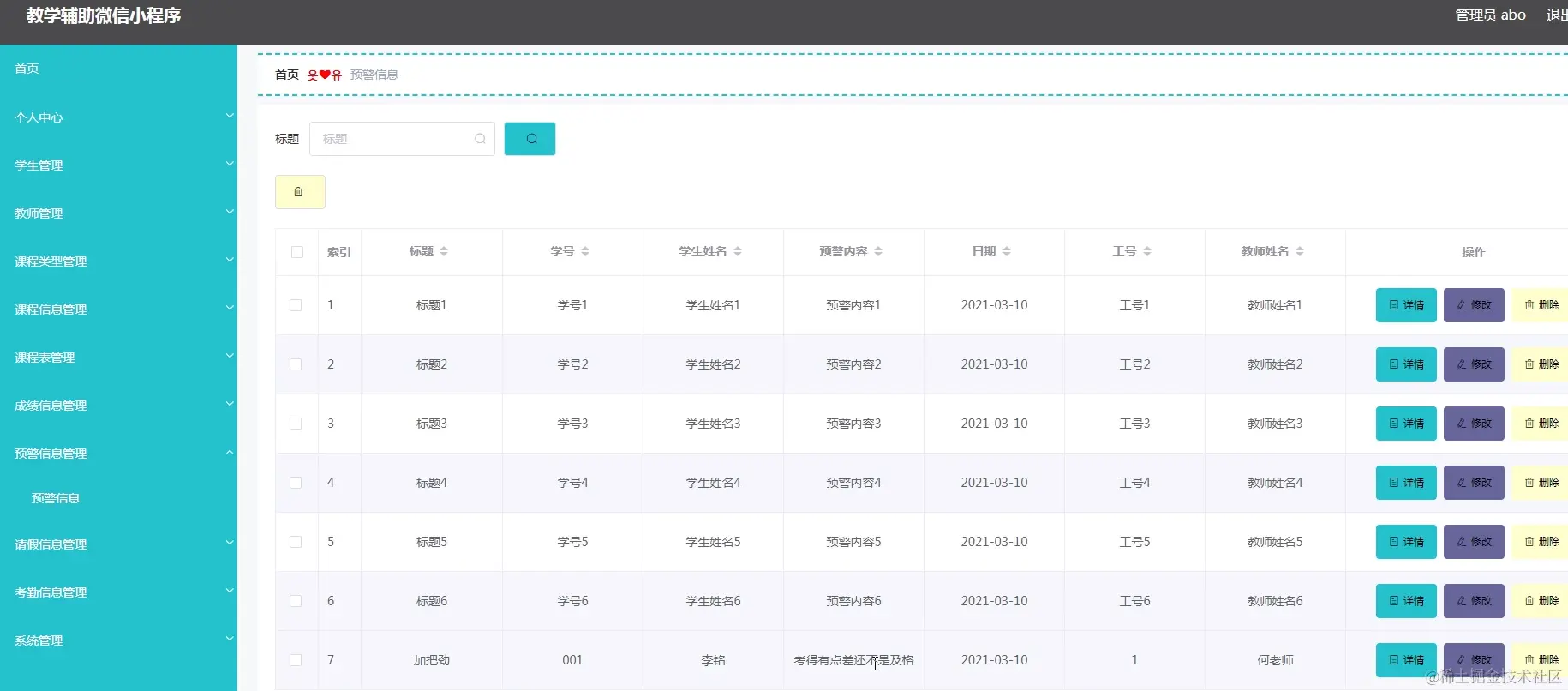 预警信息管理,管理员在预警信息页面查看学生成绩信息等,可进行详情、修改、删除操作如图5-21所示。