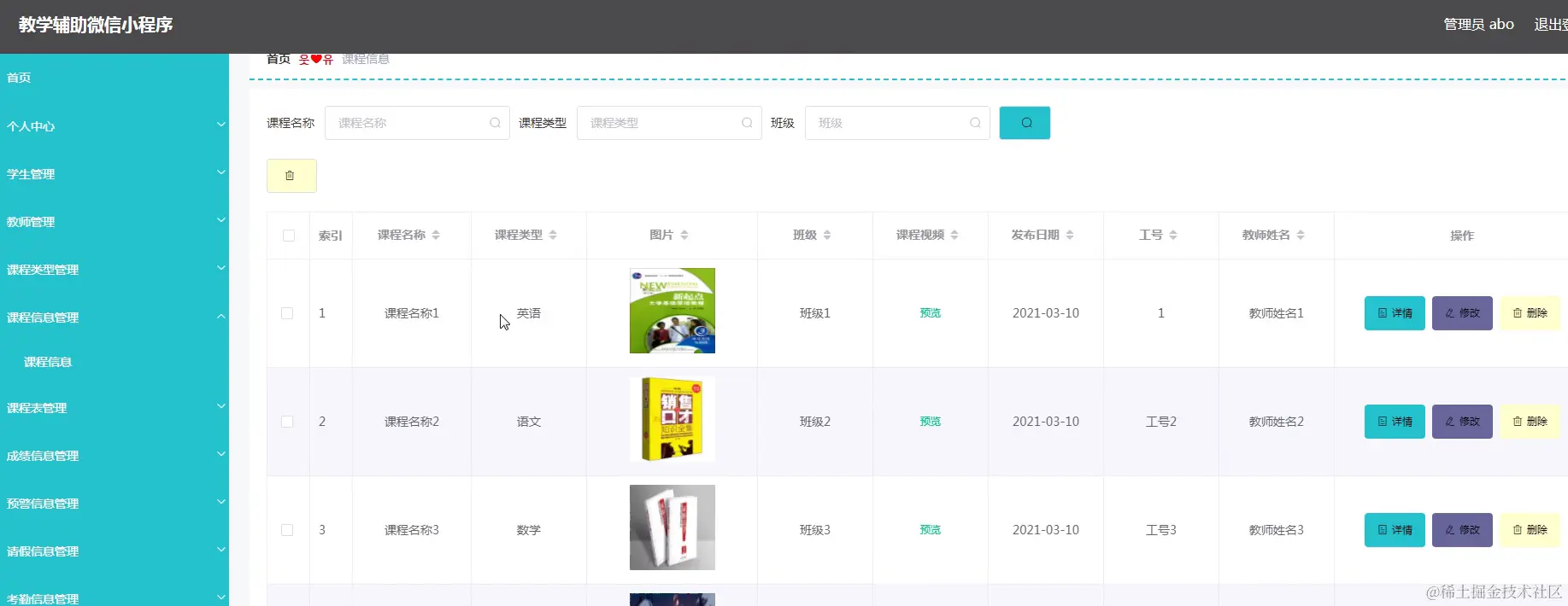 课程信息管理,管理员在课程信息查看课程名称、课程类型、图片、班级、课程视频、发布日期、工号、教师姓名等进行详情、修改、删除操作如图5-20所示。