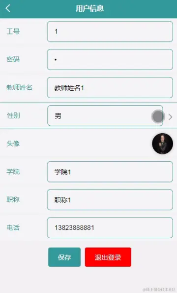 教师信息,在教师信息页面可以编辑工号、教师姓名、性别、头像、学院、职称、电话 等信息,并可根据需要进行添加、删除、修改进行保存,如图5-5所示。