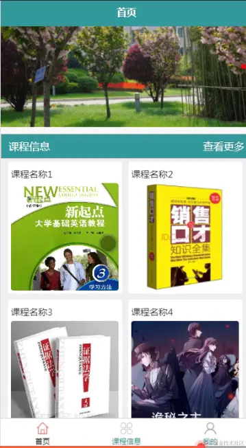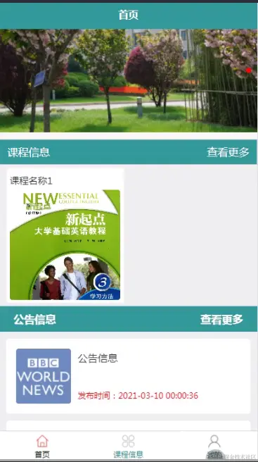 首页,学生通过登陆进入教学辅助界面查看首页、课程信息、我的等信息,如图5-9所示。