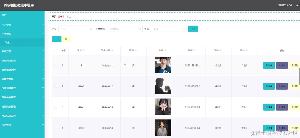 学生管理,管理员在学生管理查看编辑学号、学生姓名、性别、头像、手机、学院、专业等进行详情、修改、删除操作如图5-18所示。