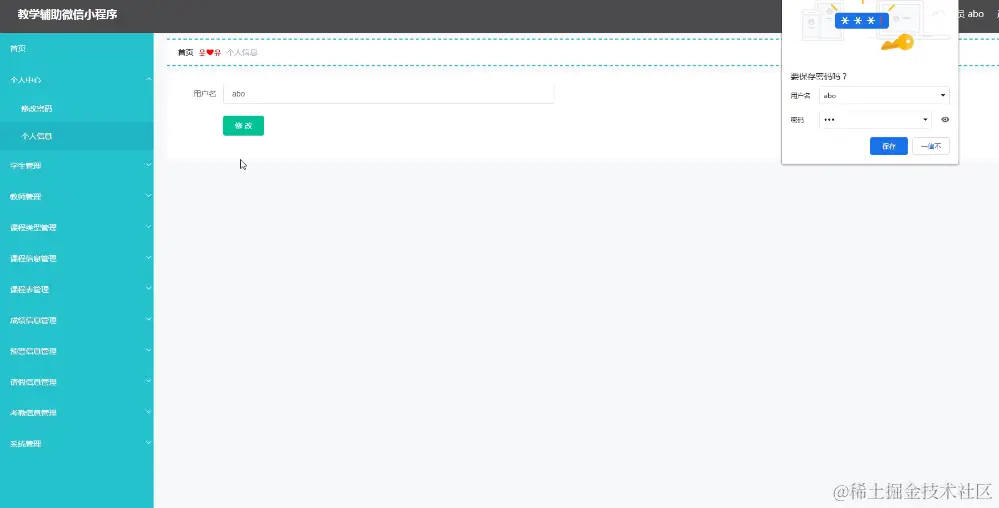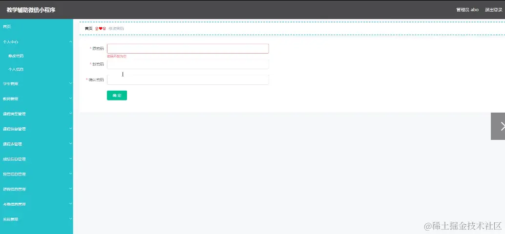 管理员进入到首页界面进行查看首页、个人中心、学生管理、教师管理、课程类型管理、课程信息管理、课程表管理、成绩信息管理、预警信息管理、请假信息管理、考勤信息管理、系统管理等功能模块,如图5-16所示。管理员对个人中心进行操作填写原密码、新密码、确认密码并进行添加、删除、修改以及查看,程序成效图如下图5-17所示