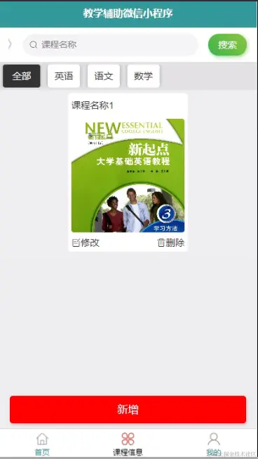 课程信息,教师在课程信息页面可以查看各课程信息,并可根据需要对课程信息进行搜索、新增,如图5-6所示。