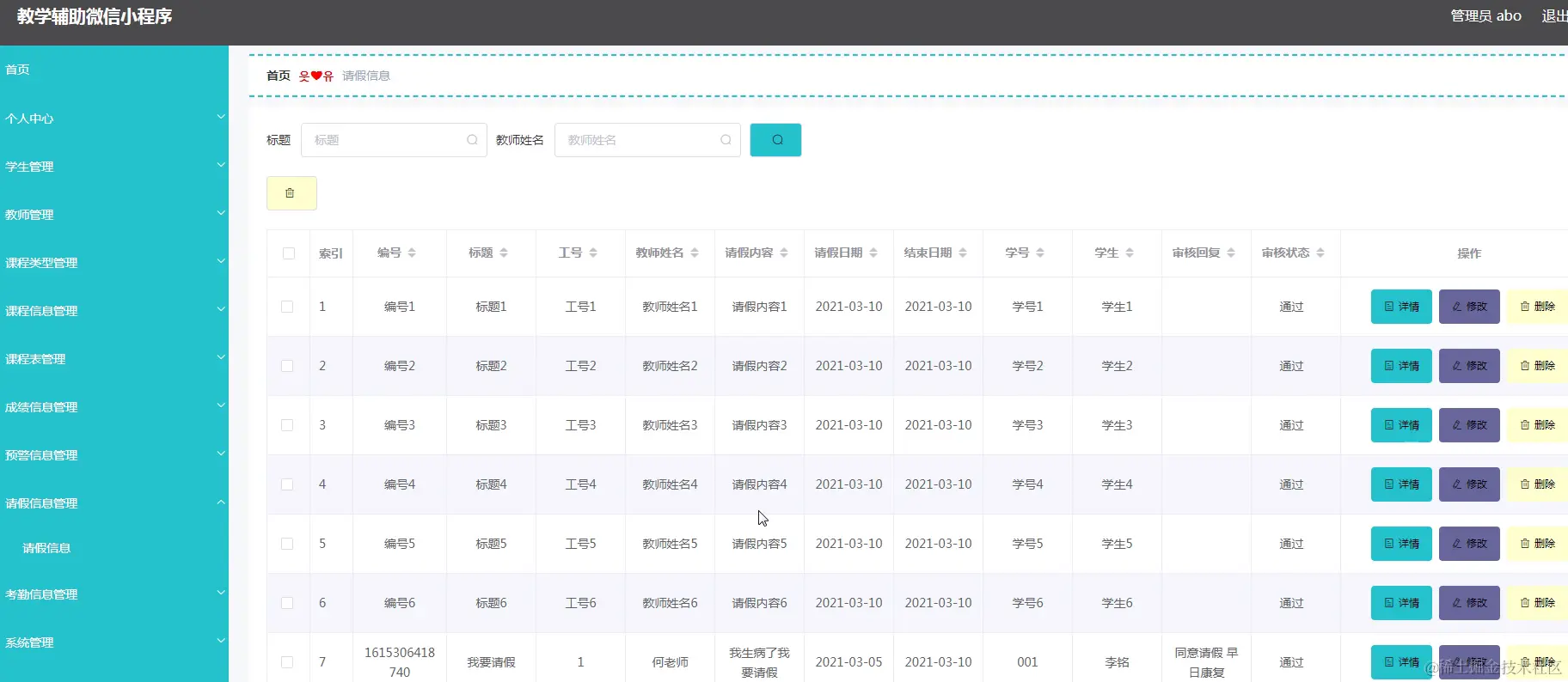 请假信息管理,管理员在请假信息页面进行查看请假信息等,可进行审核、详情、修改、删除操作如图5-22所示。