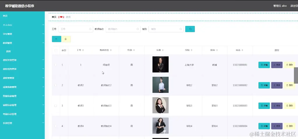 教师管理,管理员在教师管理查看编辑工号、教师姓名、性别、头像、学院、职称、电话 等进行详情、修改、删除操作如图5-19所示。