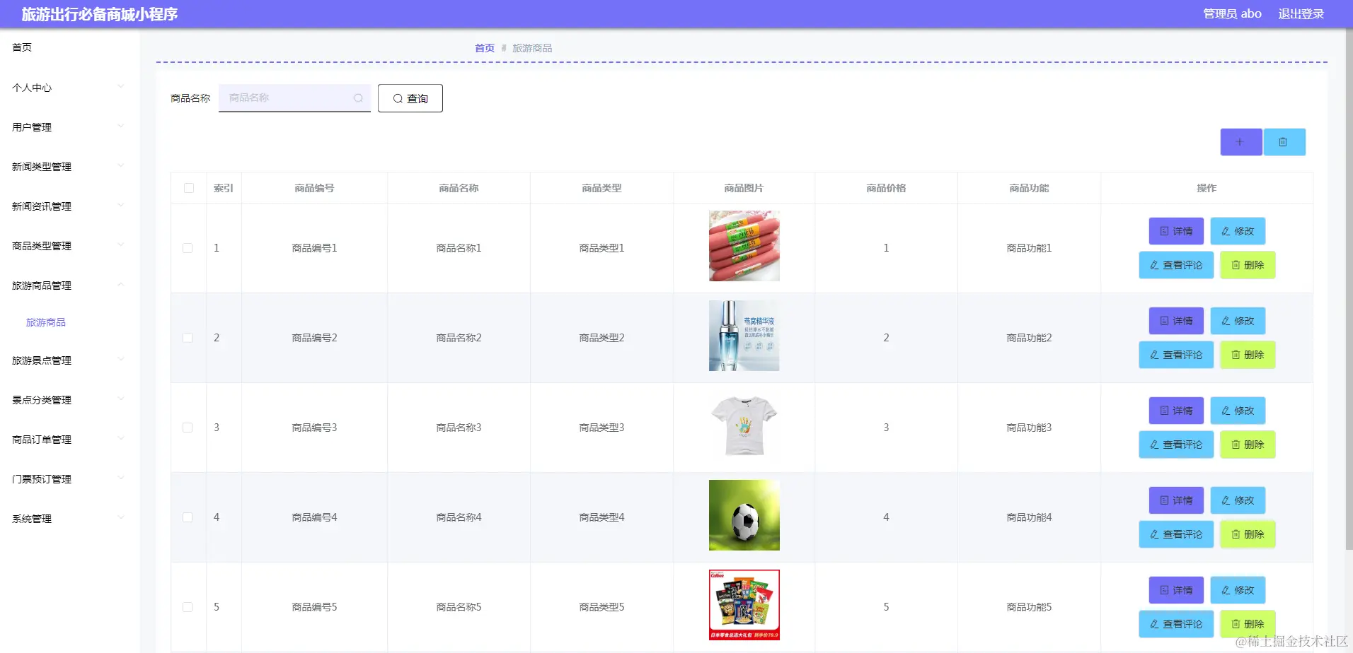 管理员进入指定功能操作区之后可以管理旅游商品。其页面见下图。管理员增删改查旅游商品信息,查看旅游商品的评论。