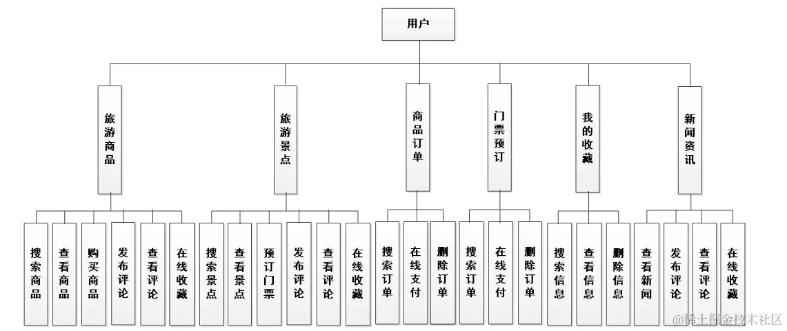 在前面分析的用户功能的基础上,进行接下来的设计工作,最终展示设计的用户结构图(见下图)。用户购买旅游出行必备的商品,预订景点的门票,在线支付商品订单和门票预订订单,可以评论并收藏商品,新闻和景点。
