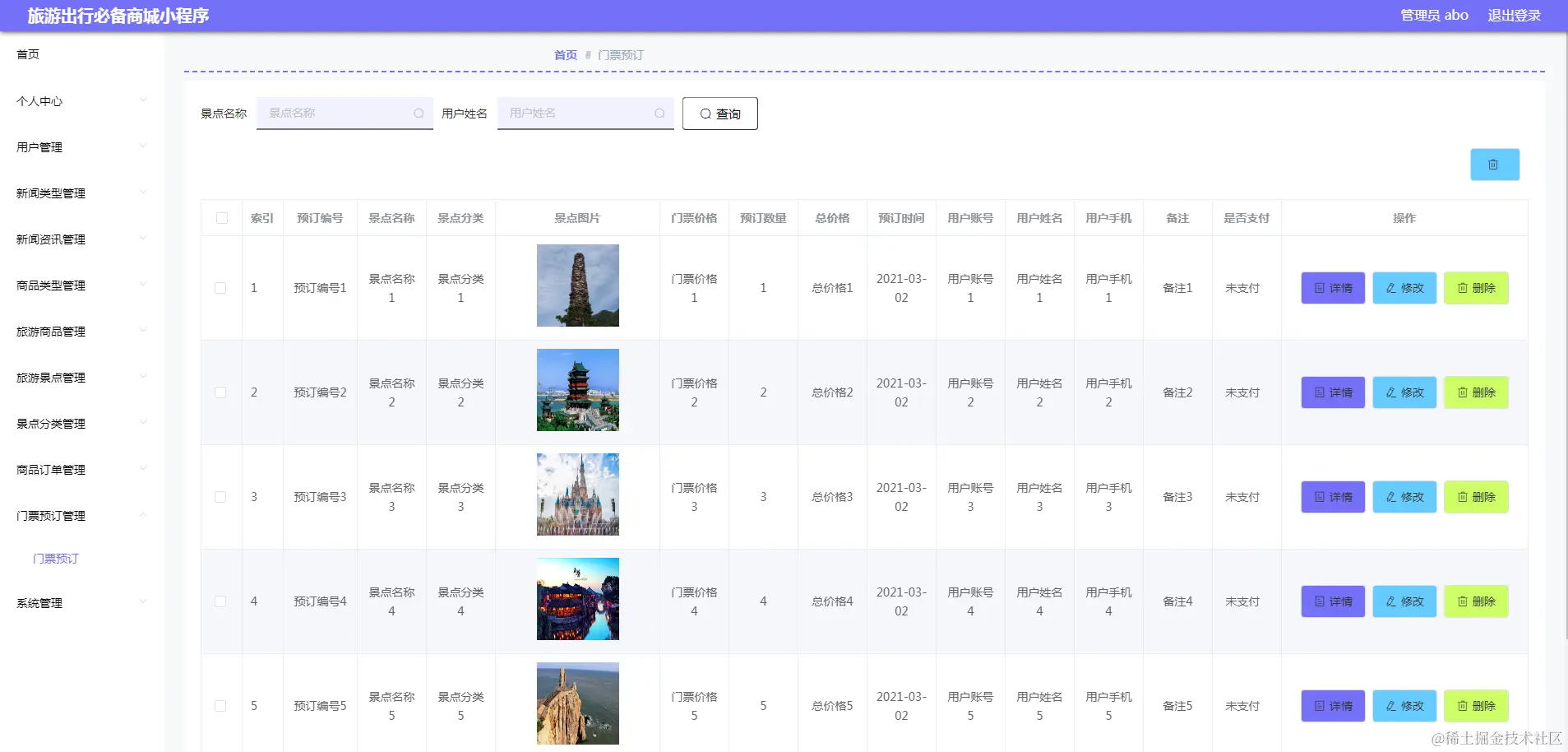 管理员进入指定功能操作区之后可以管理门票预订信息。其页面见下图。管理员查看门票预订详情,查询门票预订订单,查看该订单是否支付。