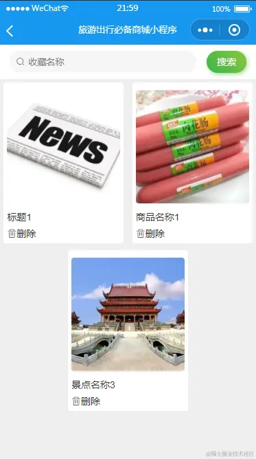 用户进入指定功能操作区之后可以查看收藏信息。其页面见下图。用户可以查看收藏的新闻,收藏的商品或收藏的景点信息。用户也能删除收藏的信息。