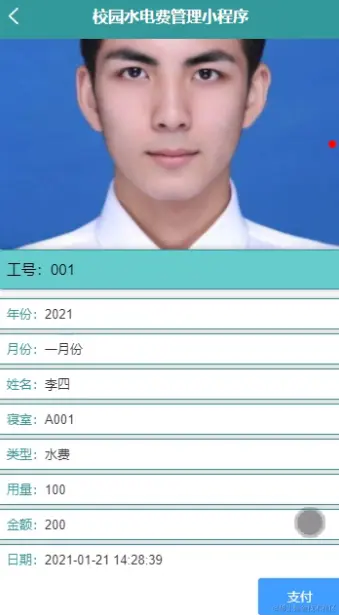 在教师缴费页面可以填写年份、月份、工号、姓名、照片、寝室、类型、用量、金额、日期、是否支付等信息,并可根据需要对教师缴费进行支付,如图5-12所示。