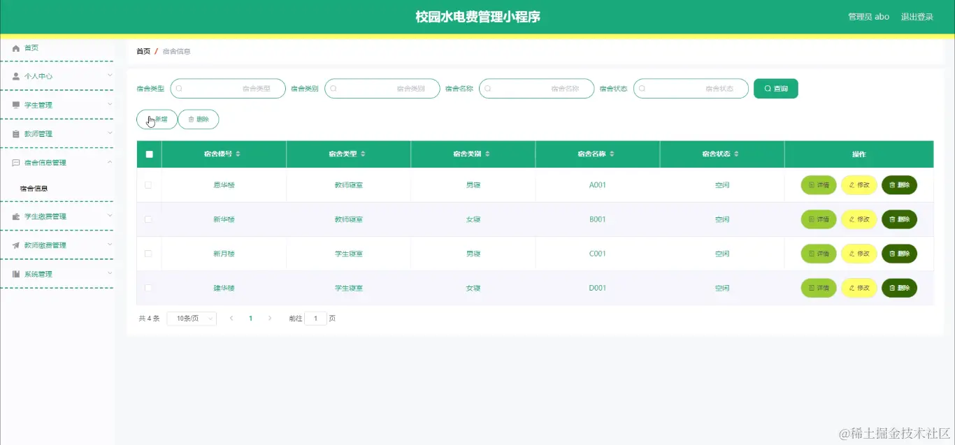 宿舍信息管理,通过填写宿舍楼号、宿舍类型、宿舍类别、宿舍名称、宿舍状态等信息进行详情、修改、删除操作,如图5-15所示。