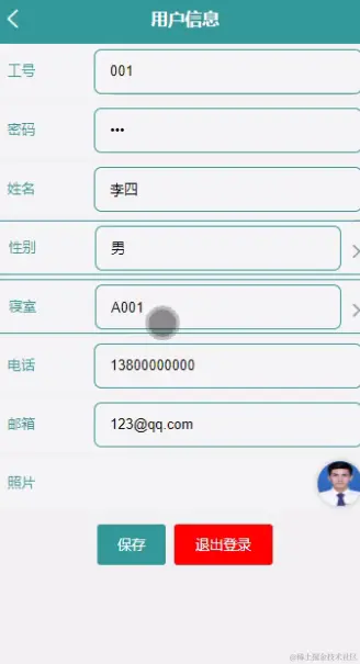 在用户信息页面可以填写工号、密码、名、性别、寝室、电话、邮箱、照片等信息,并可根据需要进行保存、退出登录,如图5-11所示。