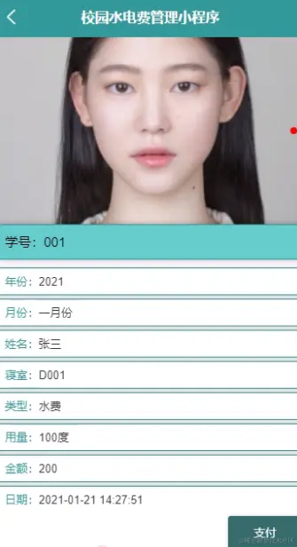 在学生缴费页面可以填写年份、月份、学号、姓名、照片、寝室、类型、用量、金额、日期、是否支付等信息,并可根据需要对学生缴费进行支付,如图5-7所示。
