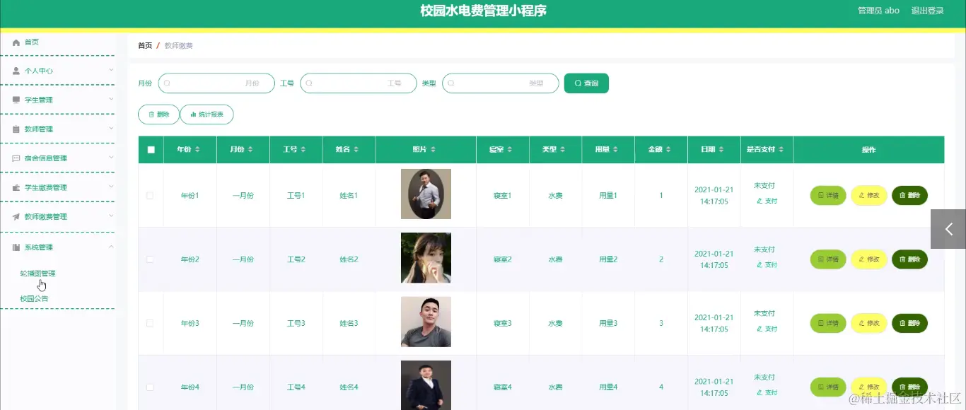 教师缴费管理,通过填写年份、月份、工号、姓名、照片、寝室、类型、用量、金额、日期、是否支付等信息进行详情、修改、删除操作,如图5-18示。