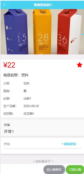 用户进入商品信息页面可以填写商品名称、分类、图片、规格、品牌、生产日期、保质期、价格等信息,进行加入购物车、立即购买操作,如图5-8-所示。