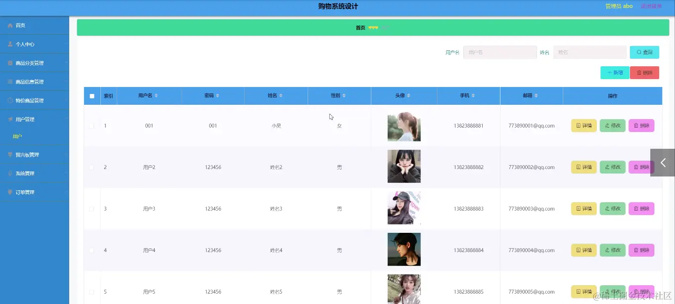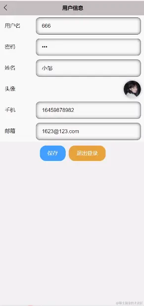 用户进入用户信息页面可以填写用户名、密码、姓名、性别、头像、手机、邮箱等信息,进行保存、退出登录操作,如图5-5-所示。