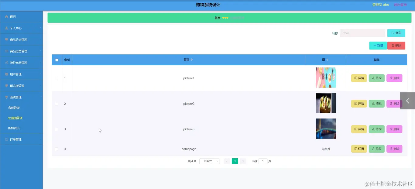 轮播图;该页面为轮播图管理界面。管理员可以在此页面进行首页轮播图的管理,通过新建操作可在轮播图中加入新的图片,还可以对以上传的图片进行修改操作,以及图片的删除,进行相对应操作,进行相对应操作,如图5-15所示。