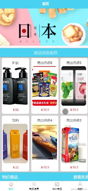 用户首页页面可以查看首页、商品信息、特价商品、我的等信息,进行提交操作,如图5-3所示。