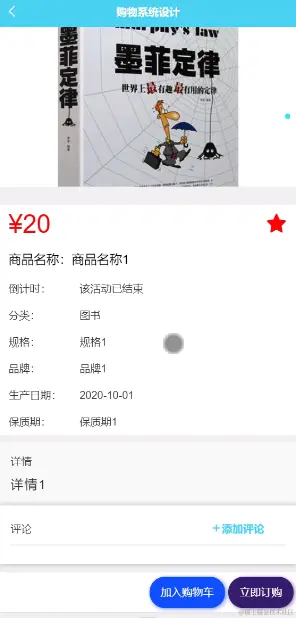用户进入特价商品页面可以填写商品名称、倒计时、分类、图片、规格、品牌、生产日期、保质期、价格等信息,进行加入购物车、立即购买操作,如图5-4所示。