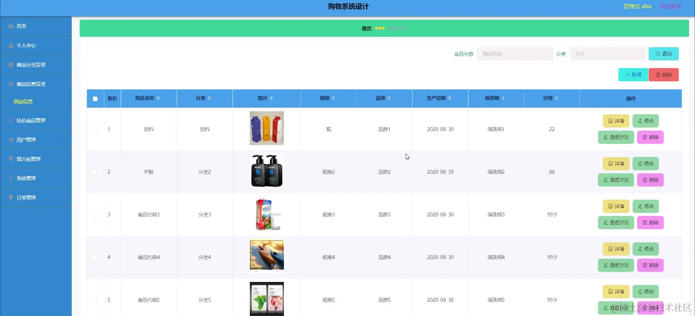 管理员点击商品信息进入页面可以填写商品名称、分类、图片、规格、品牌、生产日期、保质期、价格等信息,进行详情、修改、删除操作,如图5-11示。