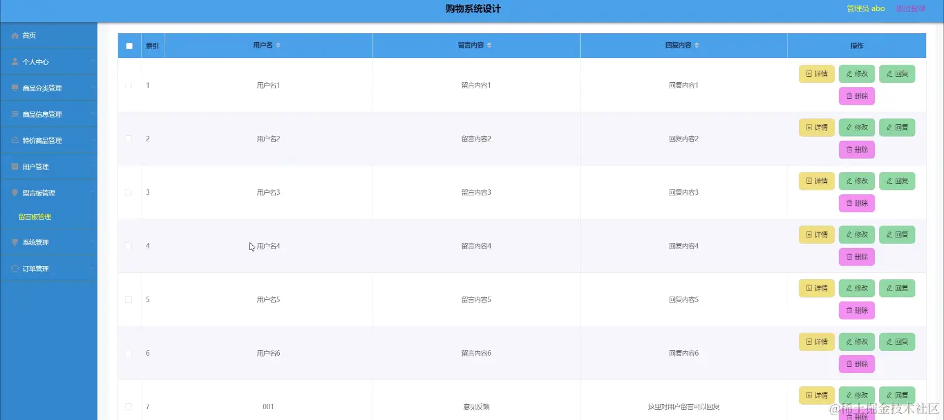 管理员进入到留言板管理界面,通过界面的任务大厅,登录成功后进入到系统可以查看用户名、留言内容、回复内容等信息,进行相对应操作,如图5-14所示。