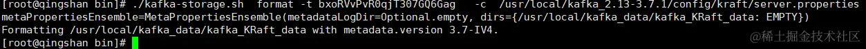 ./kafka-storage.sh format -t bxoRVvPvR0qjT307GQ6Gag -c /usr/local/kafka_2.13-3.7.1/config/kraft/server.properties