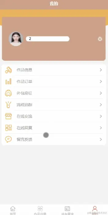 用户登陆系统前台,可以对首页,作品信息,外包需求,我的等功能进行详细操作,如图5-2所示。