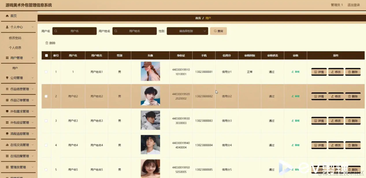 用户管理;在用户管理页面中可以对索引,用户名,用户姓名,性别,头像,身份证,手机,信用分,审核回复,审核状态,审核等内容进行详情,修改和删除操作;如图5-6所示。