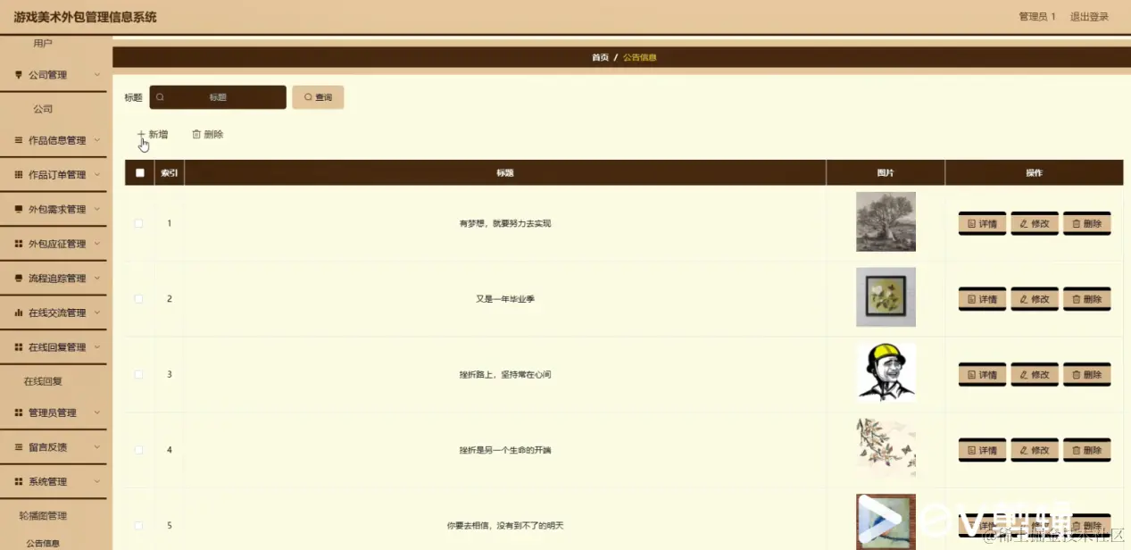 公告信息;在公告信息页面中可以对索引,标题,图片等内容进行详情,修改和删除操作;如图5-8所示。
