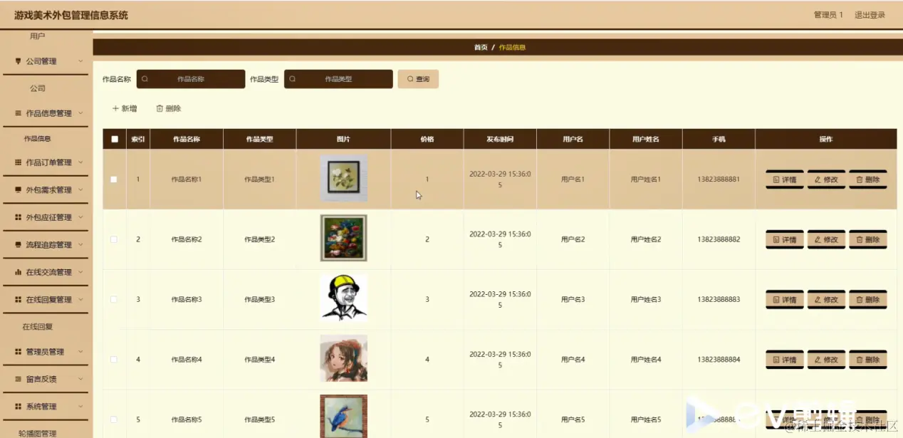 作品信息管理;在作品信息管理页面中可以对索引,作品名称,作品类型,图片,价格,发布时间,用户名,用户姓名,手机等内容进行详情,修改和删除操作;如图5-9所示。